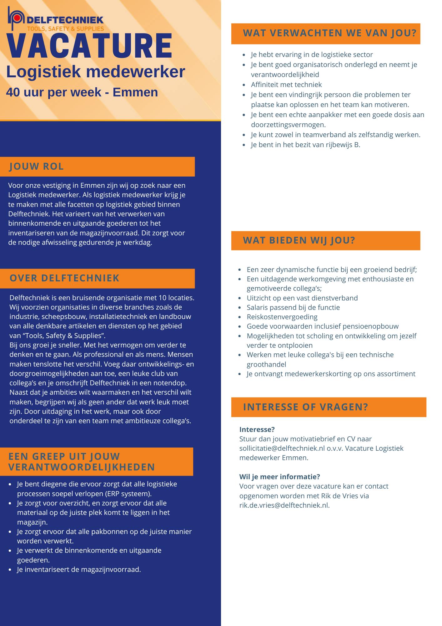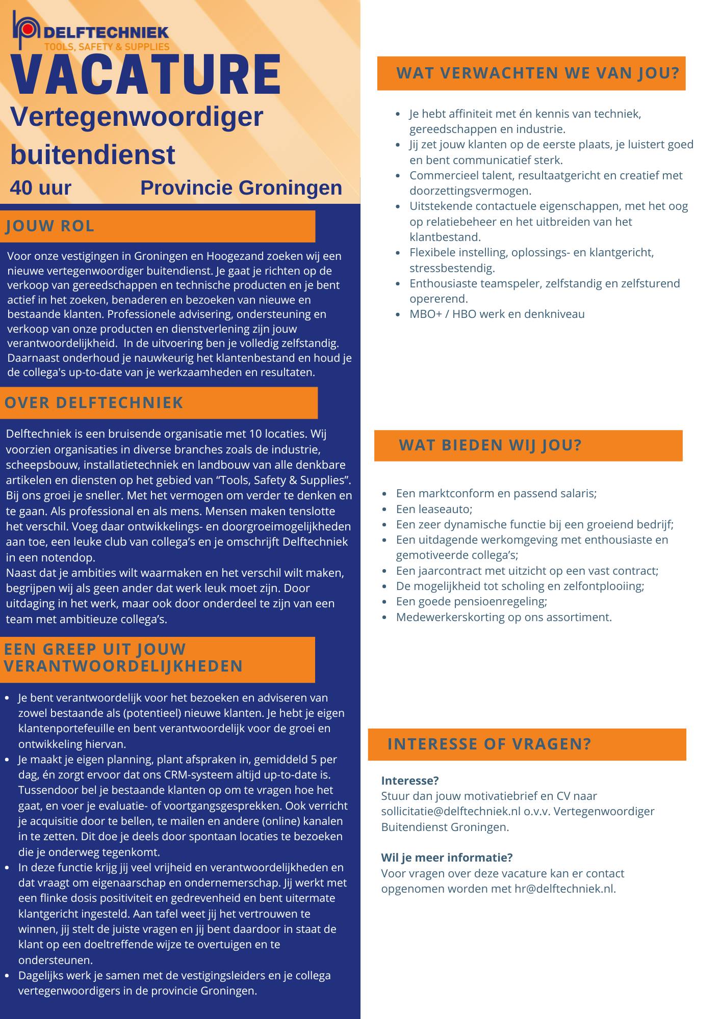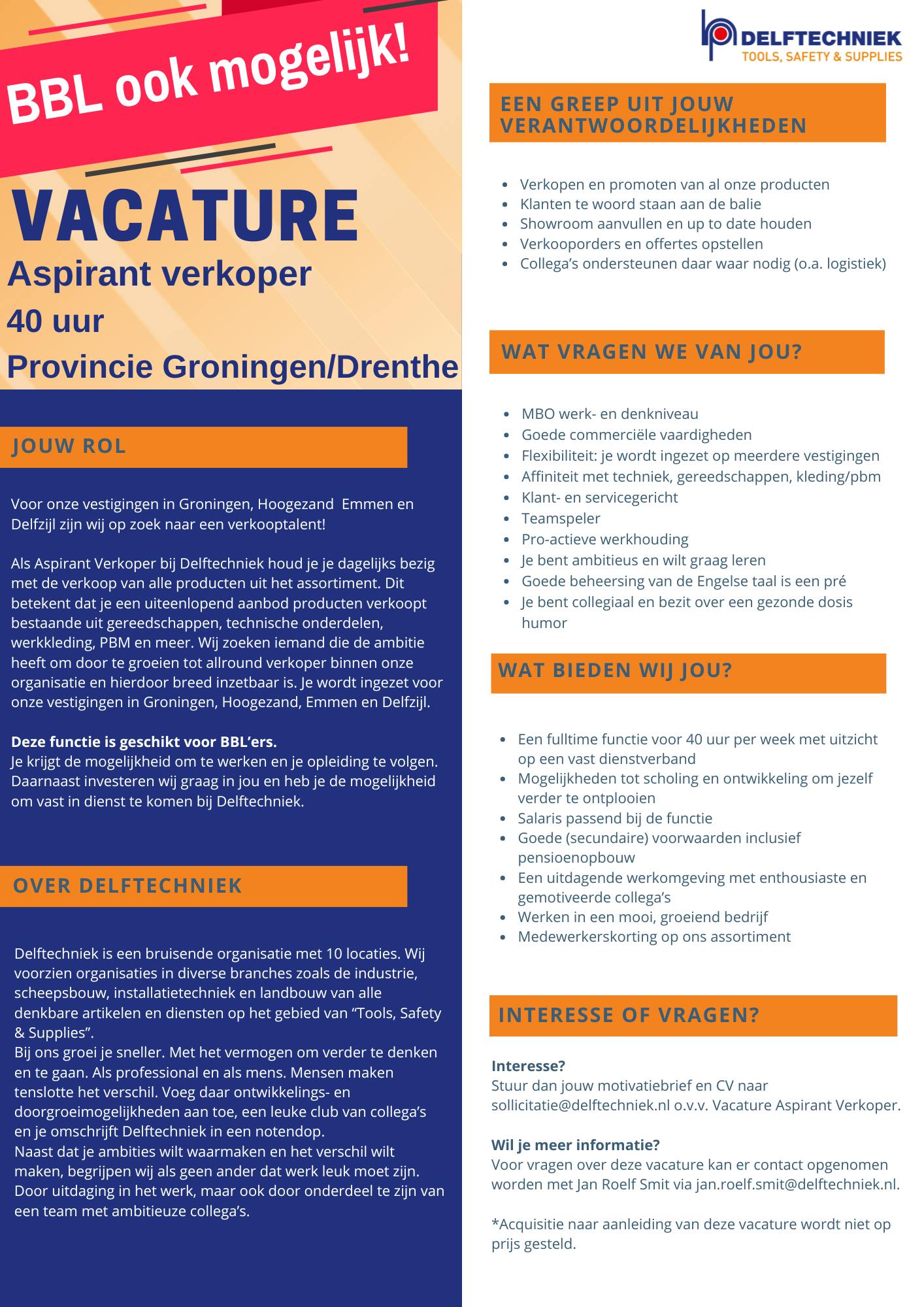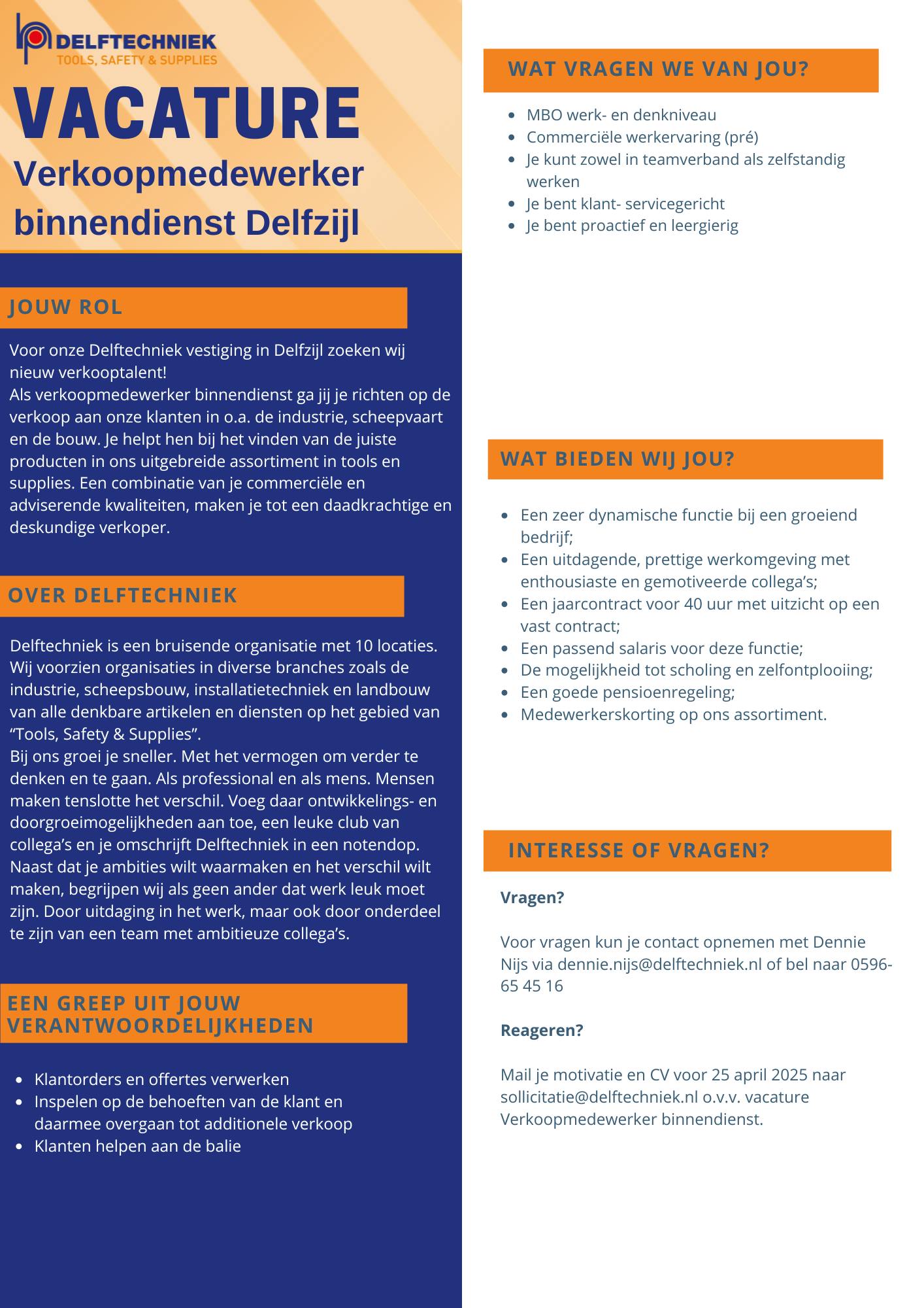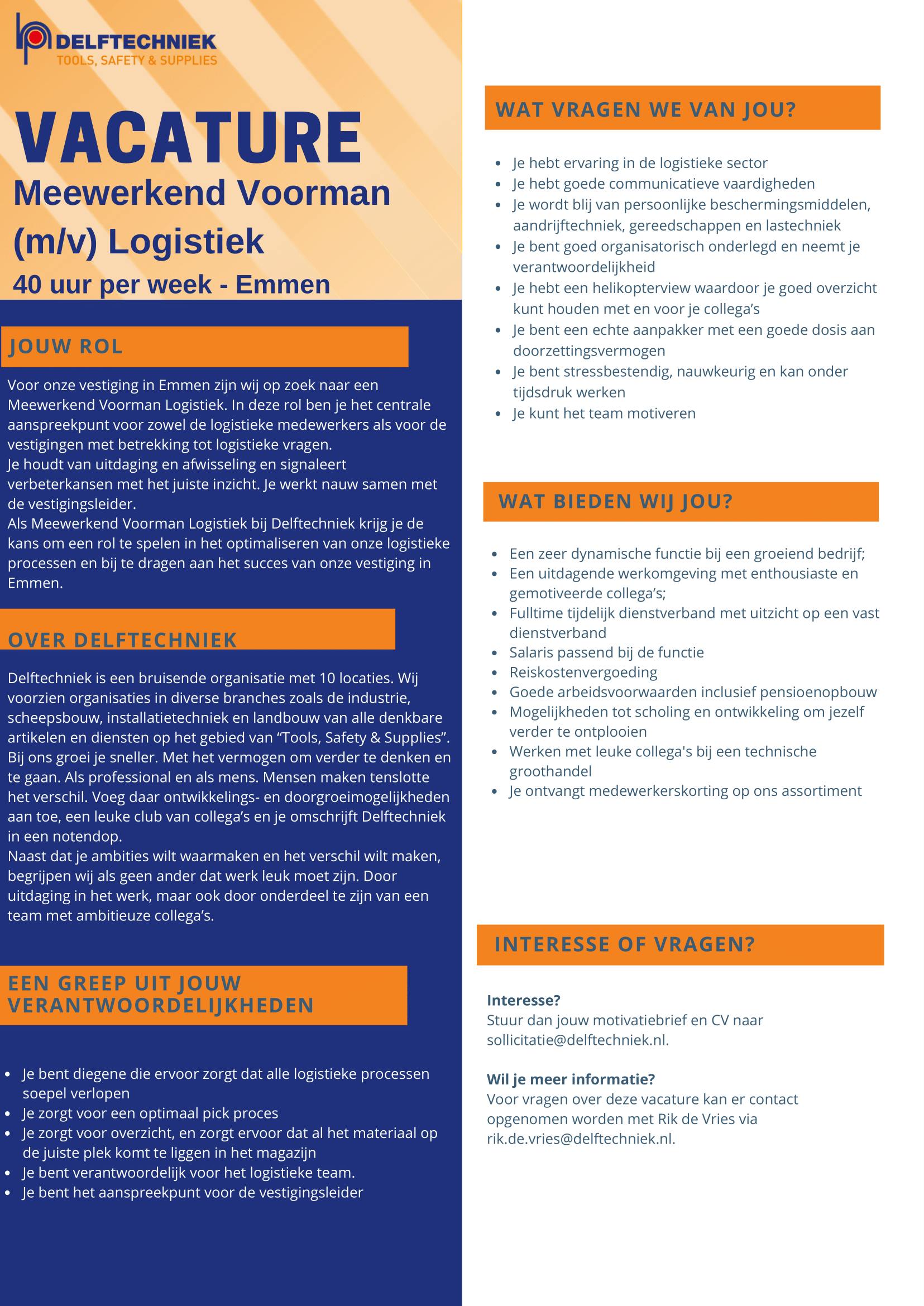 Neem telefonisch contact met ons op voor meer informatie of mail naar: sollicitatie@delftechniek.nl